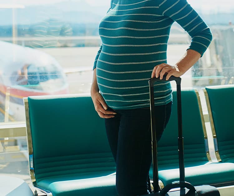 Be sure to do your homework and talk to your doctor before traveling far from home. If you plan to fly, find out from your doctor and check with the airlines as to whether there may be any potential restrictions with flying. Because pregnancy can increase the risk of deep vein thrombosis when flying, walk around the cabin regularly throughout the flight (when it’s safe to do so, as indicated by the flight crew). Try to avoid stowing your carry-on under the seat, as it can restrict movement and your ability to stretch your legs. If possible, request a bulkhead or aisle seat for extra legroom. Then take advantage of the extra space to frequently flex and extend your ankles to encourage blood flow in the lower legs. If you’re traveling by car, stop often to get out and stretch your legs.