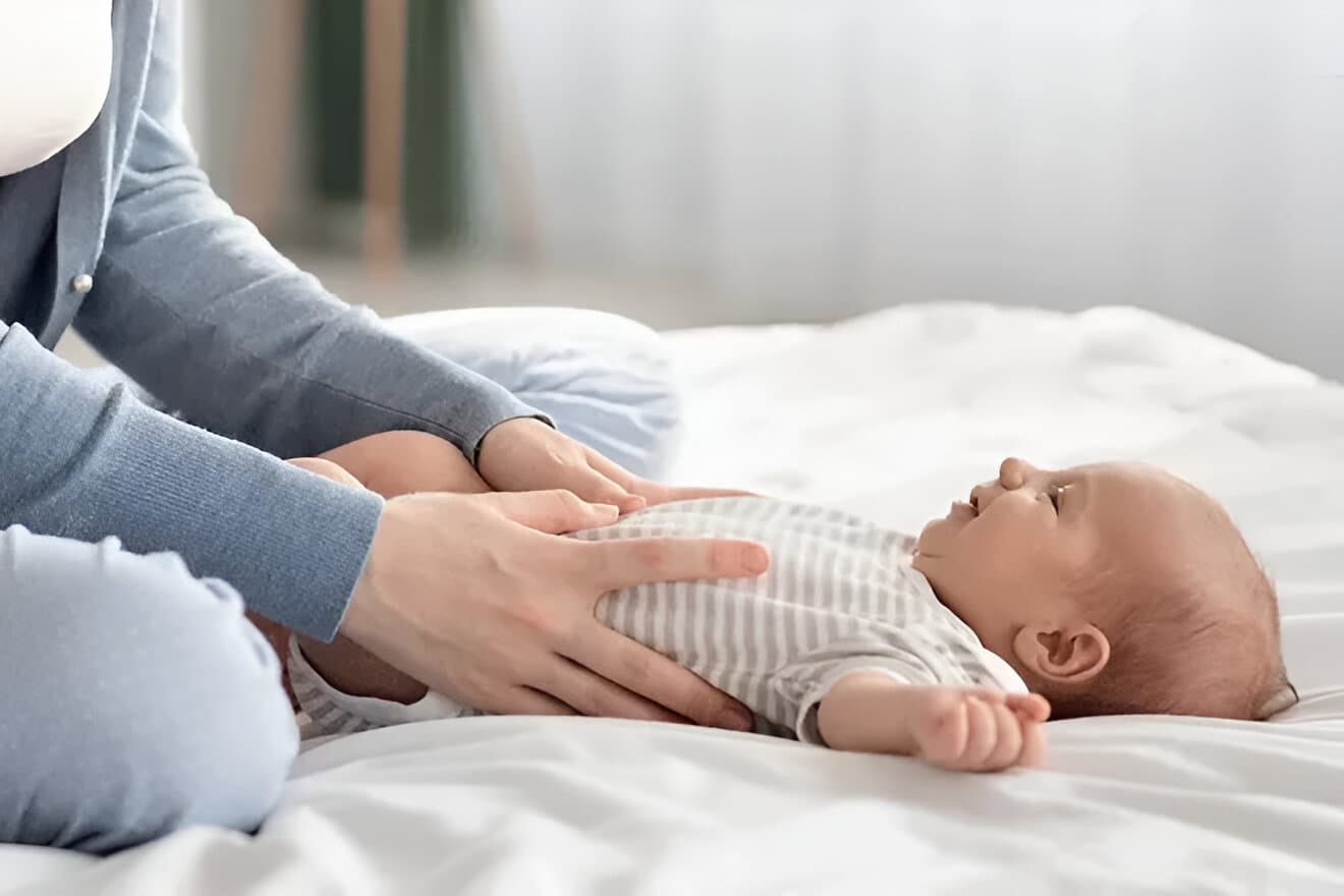 Place your baby on their back, and gently move their legs like they’re in a mini spin class. This bicycling motion can encourage stubborn gas to pass. Stop every once in a while and gently press both of your baby’s knees toward the belly.