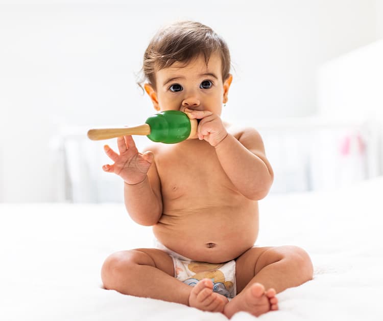 When purchasing a toy, make sure you choose ones that don't contain small parts that can easily become stuck in your baby's throat or nose. Proofing for choke-size objects is super important because it's pretty much a given that any new toy will go in your baby's mouth. That said, it's also a good idea to get your baby a teether, or some object specifically designed to be used as a chew toy. It provides a safe option for him or her to continue exploring different sensations, and it also soothes aching gums when it's teething time.